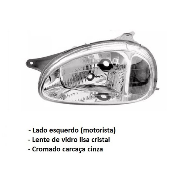 Farol Corsa Classic 2000 até 2010 Adaptável Corsa Wagon 1994 até 1999. Lado esquerdo (motorista) cromado carcaça cinza lente lisa vidro pisca cristal.